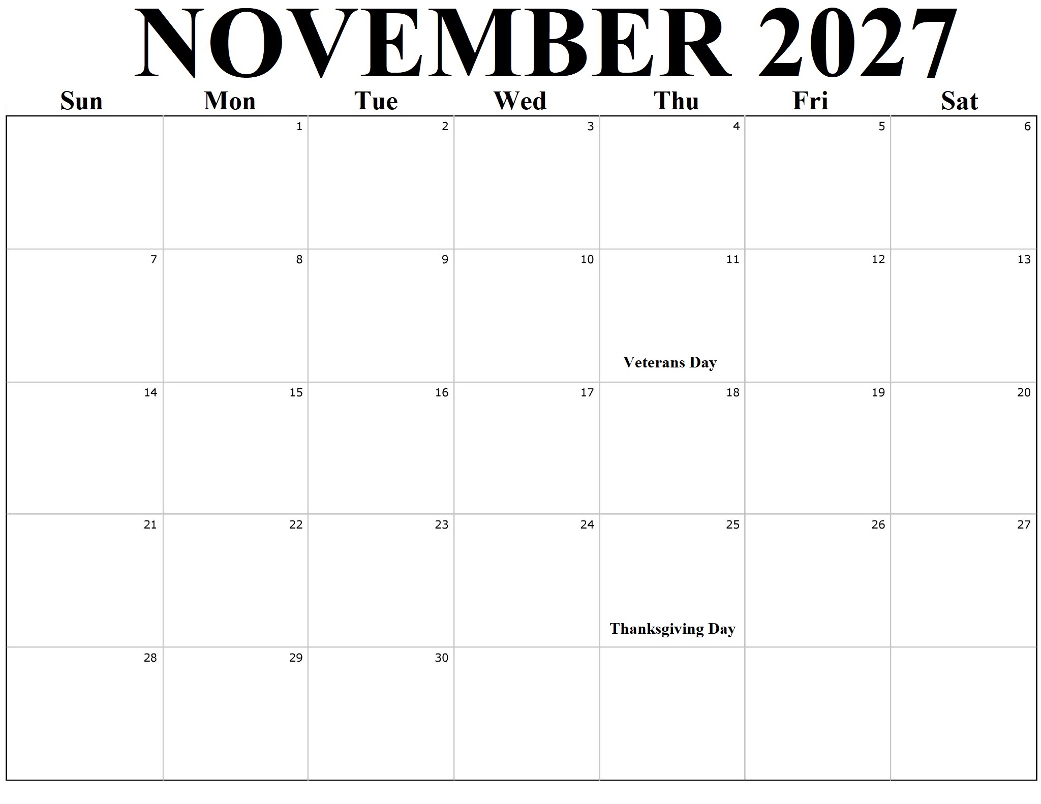 November 11, 2027 Thursday – Veterans Day Federal Holiday