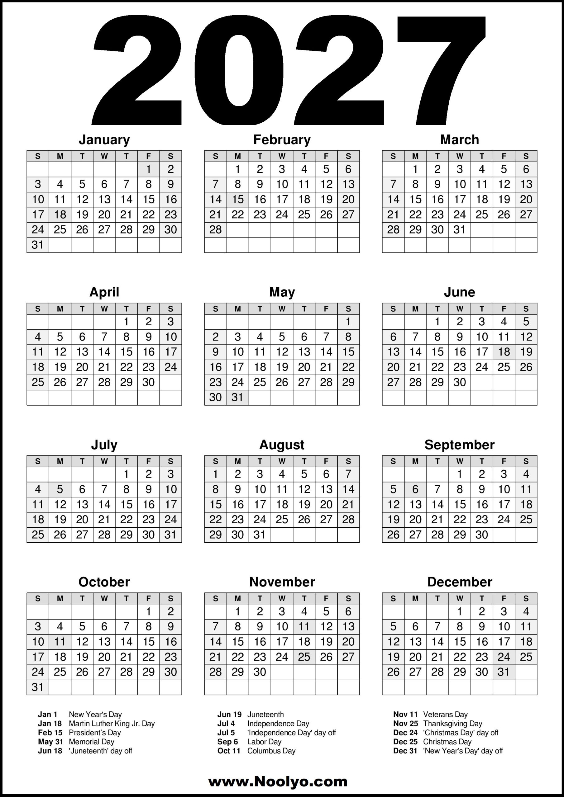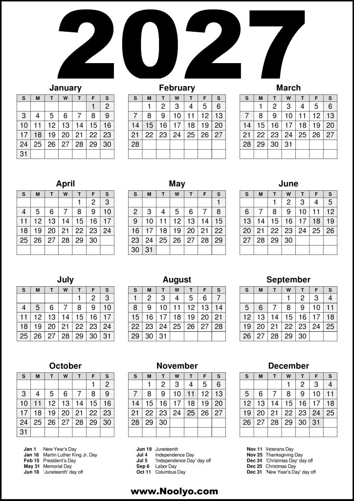 Yes! The calendar on this page is completely free to download and print. It includes all US federal holidays for 2027 and is available in monthly and yearly formats as a PDF or PNG file.