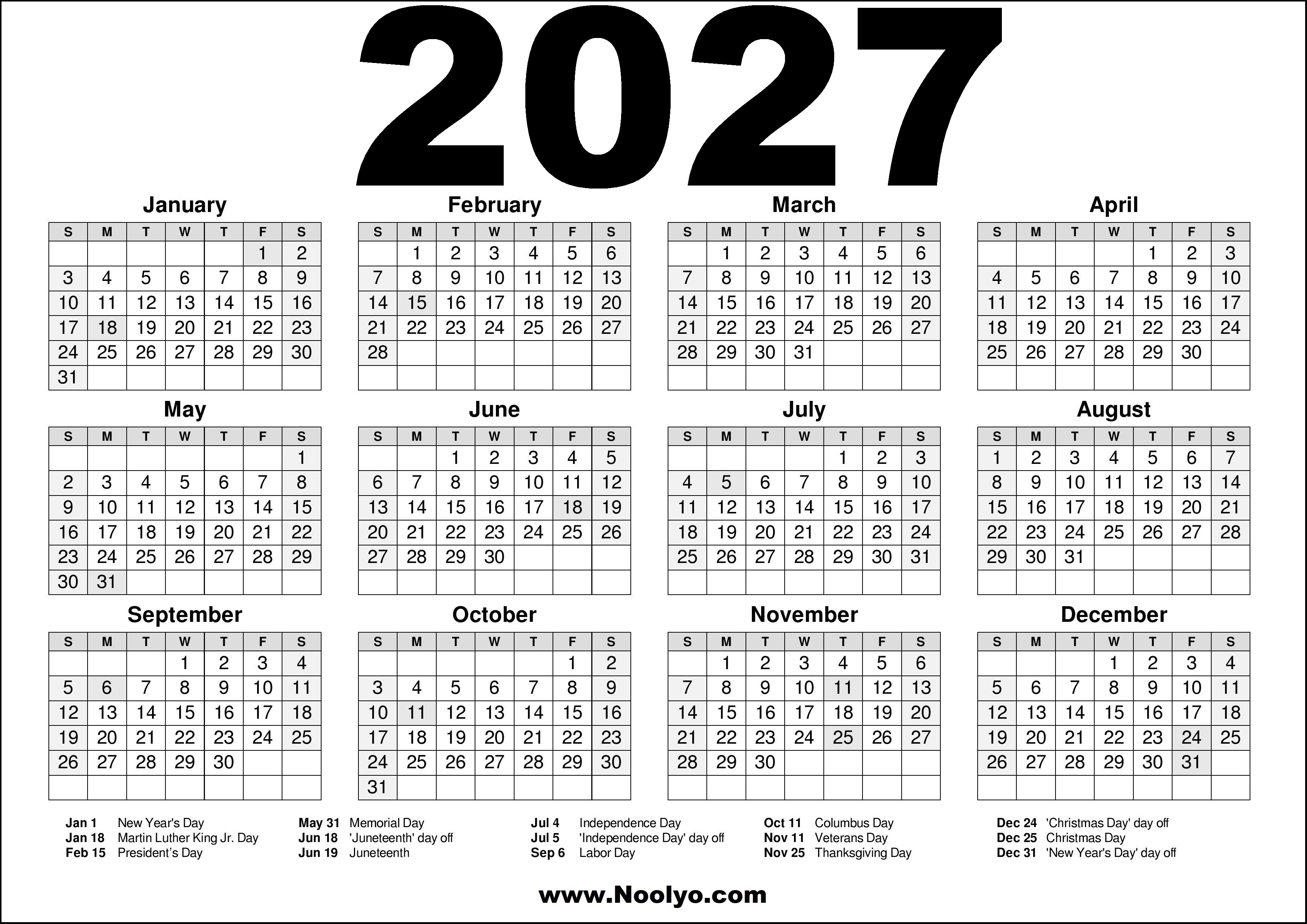 There are 11 official US federal holidays in 2027: New Year’s Day, Martin Luther King Jr. Day, Presidents’ Day, Memorial Day, Juneteenth, Independence Day, Labor Day, Columbus Day, Veterans Day, Thanksgiving Day, and Christmas Day. Some holidays that fall on weekends are observed on the nearest Monday or Friday.